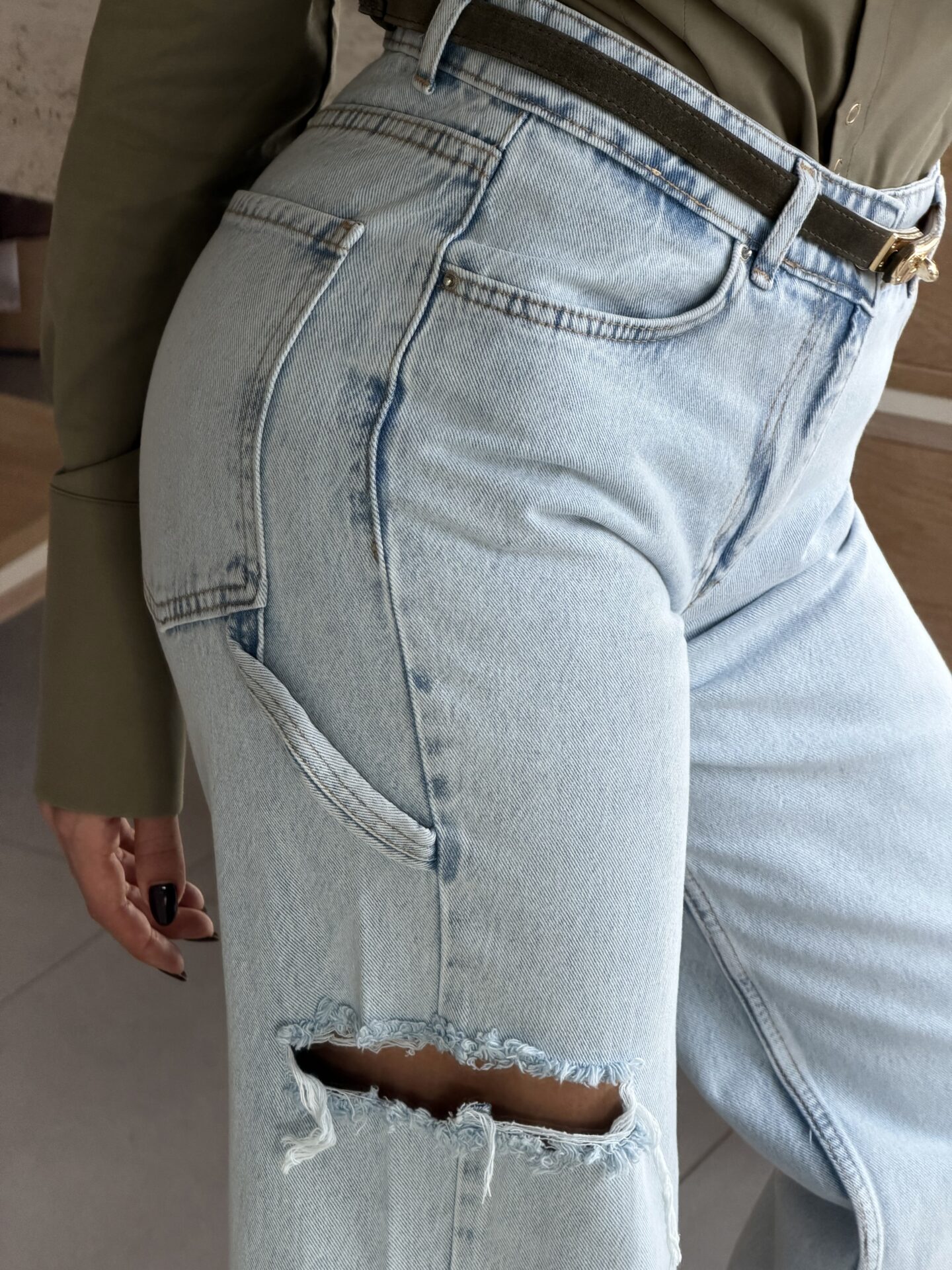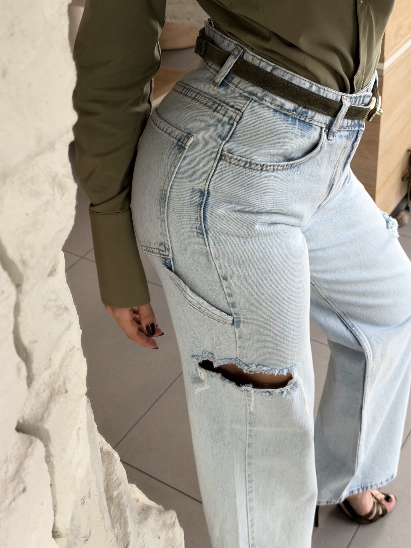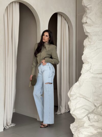 Moderne farmerke,izradjene od kvalitetnog teksasa. Sirok kroj daje opusten ali stilizovan izgled. Imaju zanimljiv procep na butini.