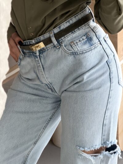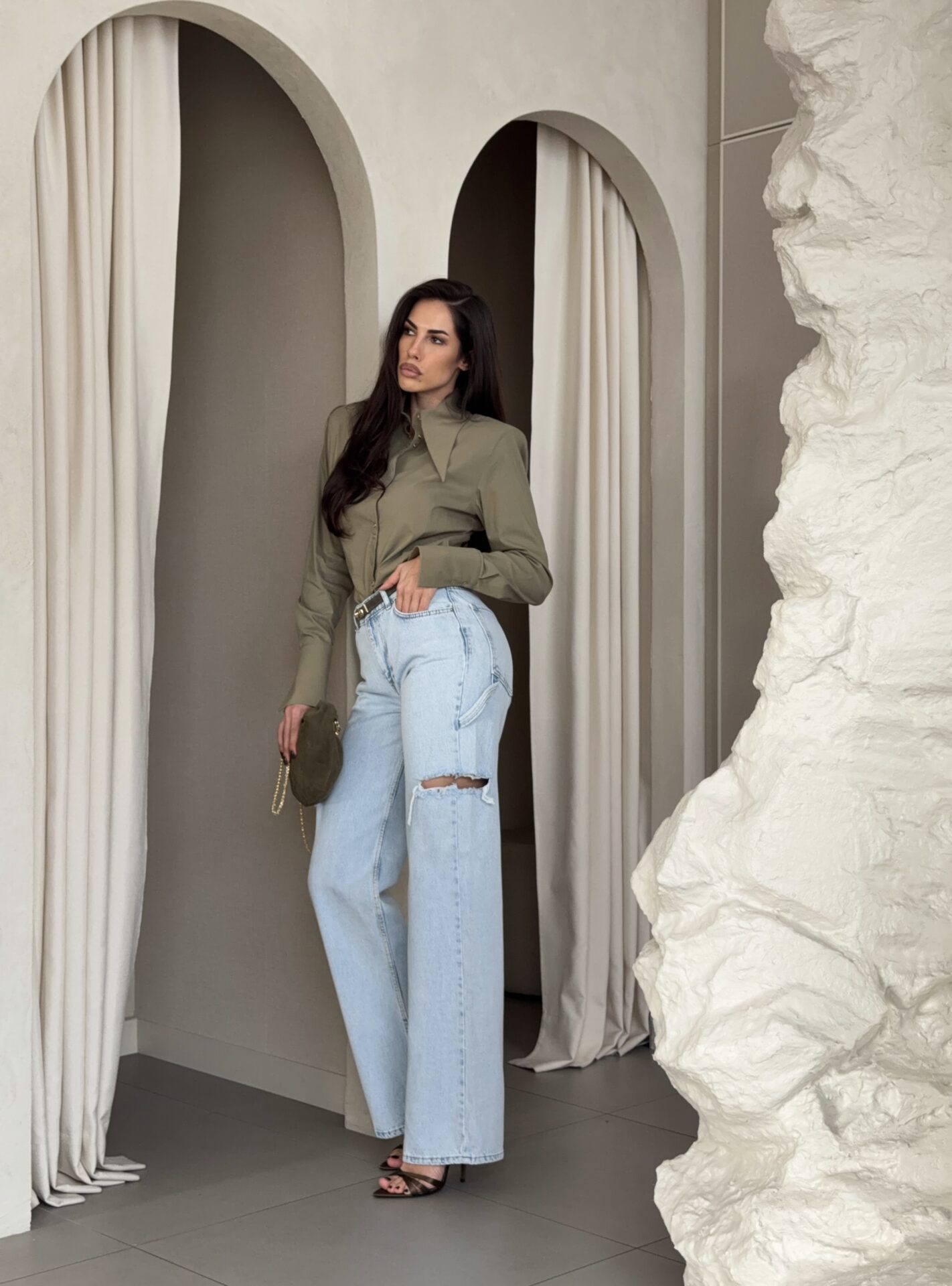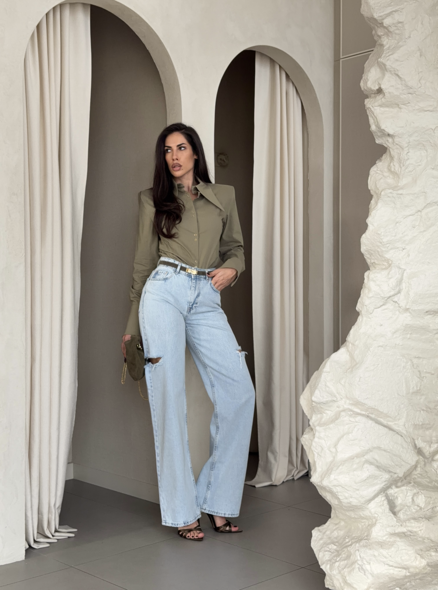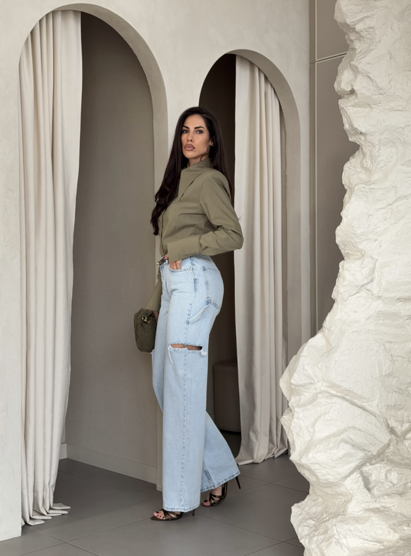 Moderne farmerke,izradjene od kvalitetnog teksasa. Sirok kroj daje opusten ali stilizovan izgled. Imaju zanimljiv procep na butini.