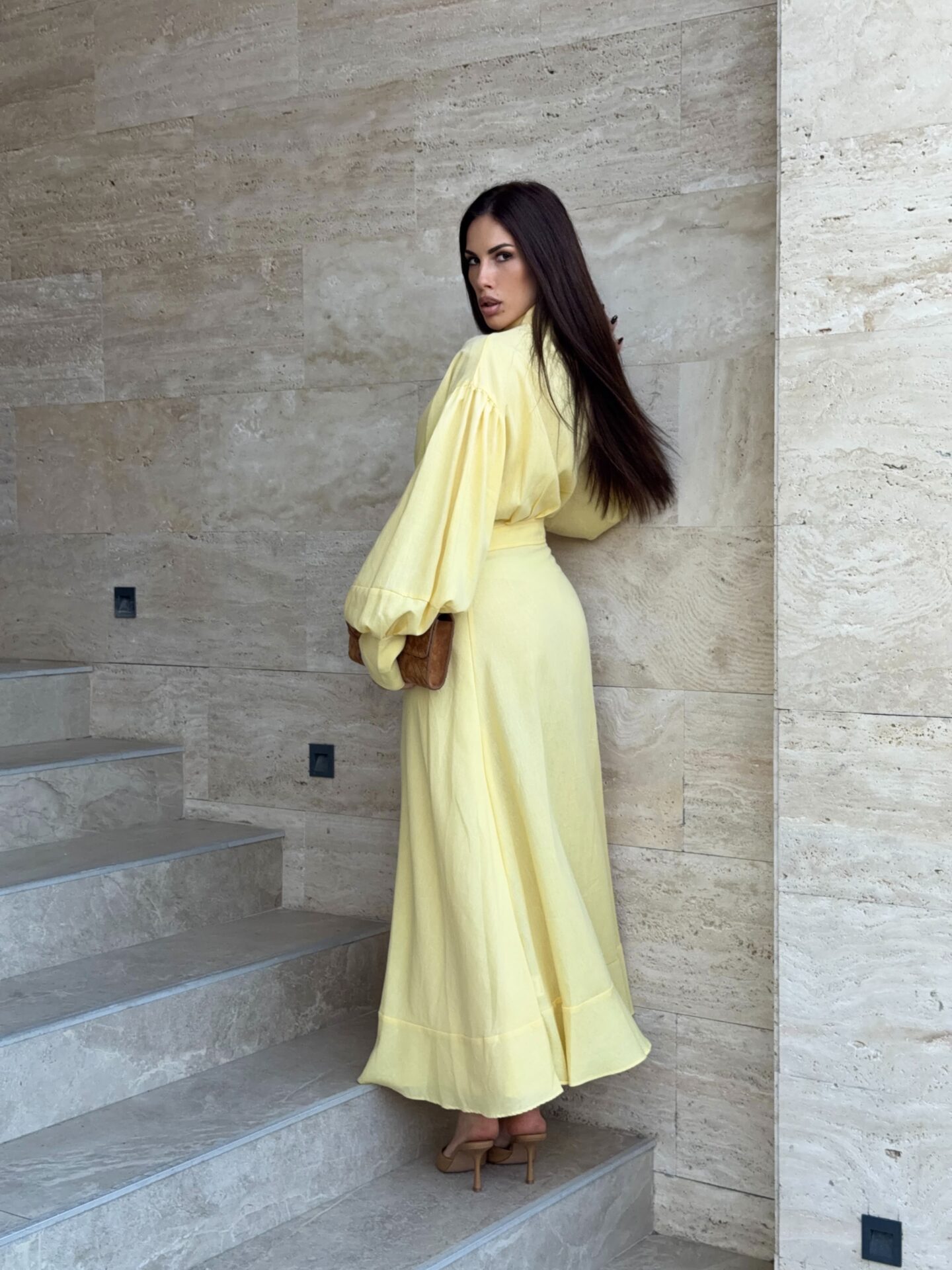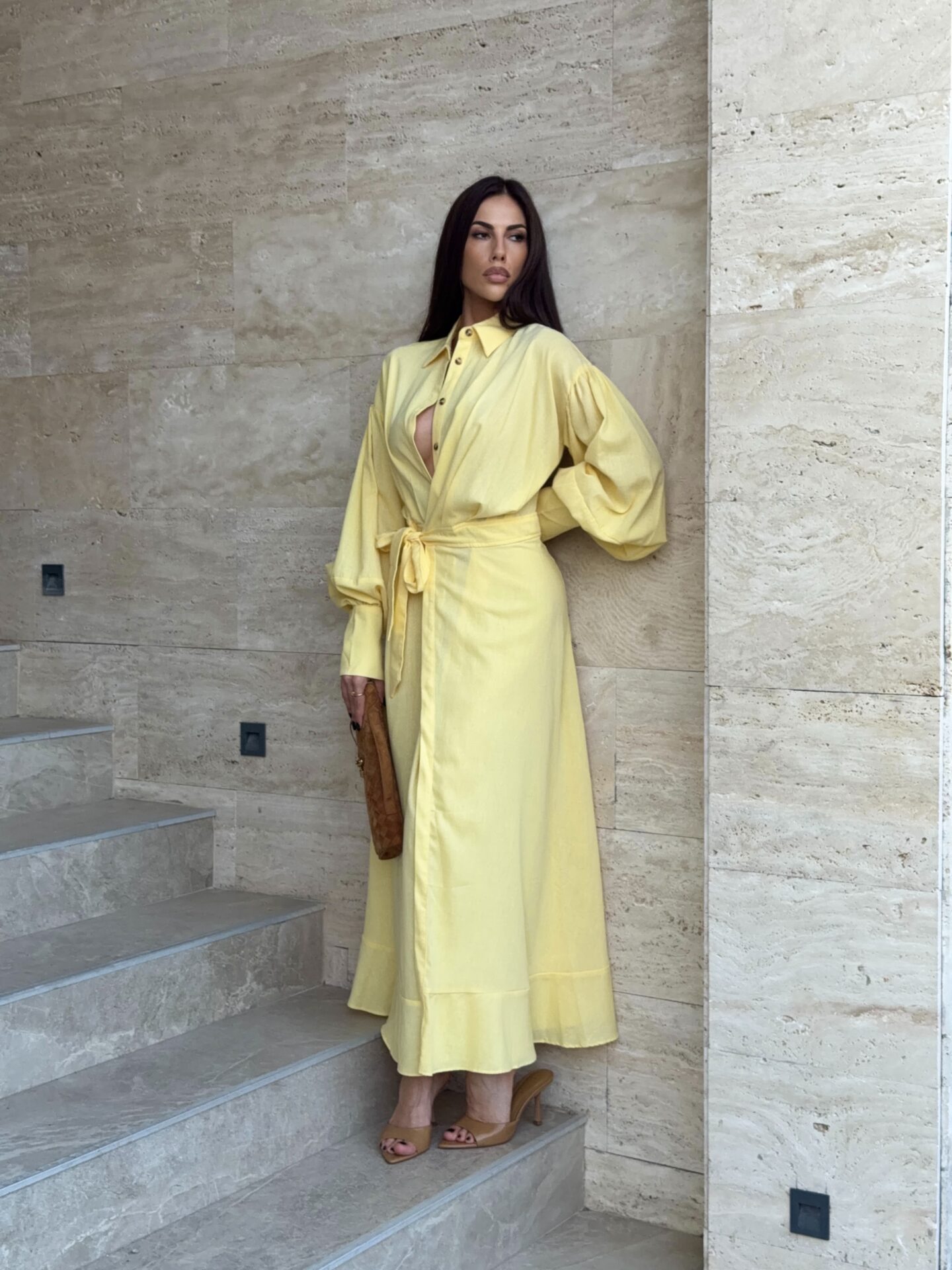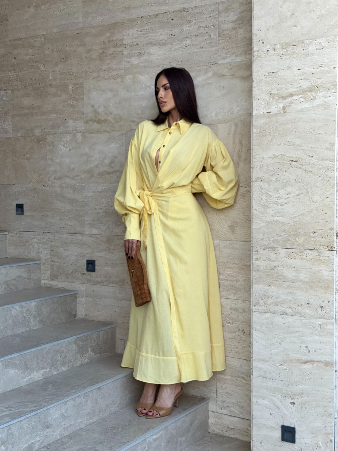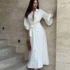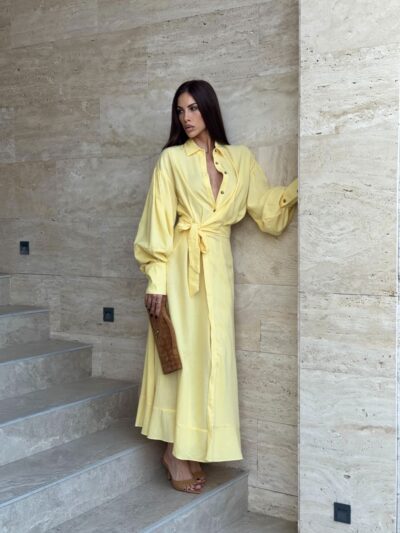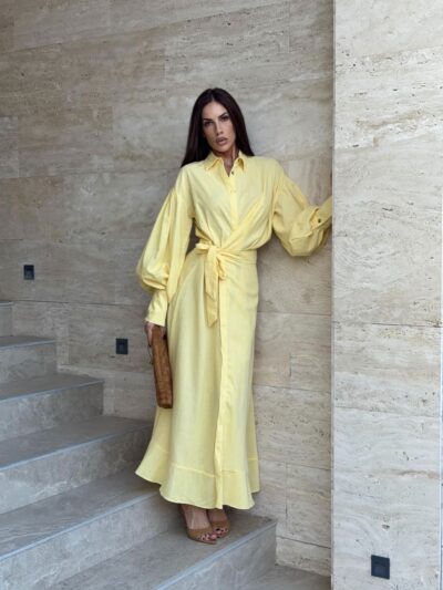 Haljina duzeg kroja.Kopcanje dugmicima,veliki puf rukavi i efektan preklop sa vezivanjem u struku koji naglasava siluetu. Minimalisticki dizajn sa upecatljivim krojem cini je idealnom za elegantne,dnevne i vecernje prilike.