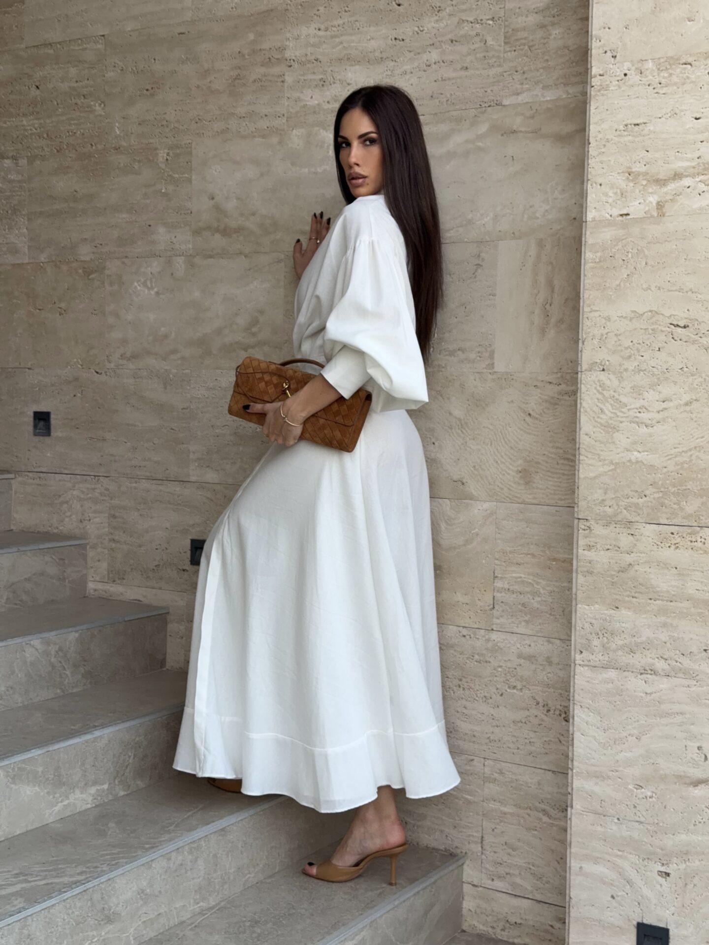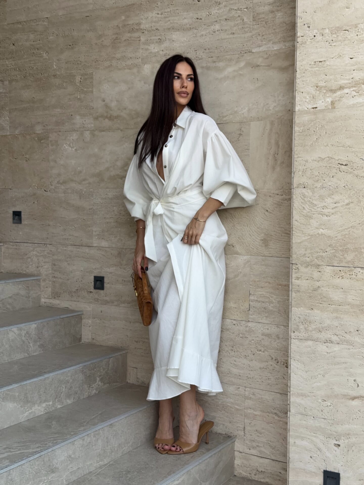 Haljina duzeg kroja.Kopcanje dugmicima,veliki puf rukavi i efektan preklop sa vezivanjem u struku koji naglasava siluetu. Minimalisticki dizajn sa upecatljivim krojem cini je idealnom za elegantne,dnevne i vecernje prilike.