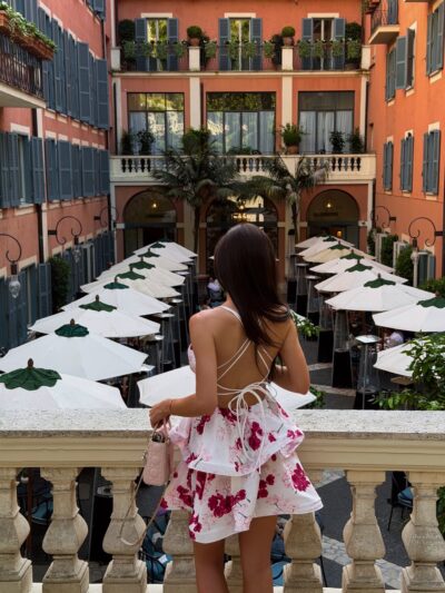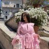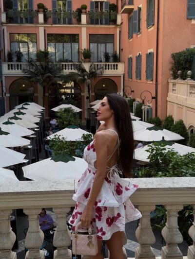 Romanticna haljina,kratkog kroja. Ima tanke bretele,gornji deo blago strukiran,prati liniju tela. Prelep dekolte,dodatno naglasava figuru. Poseban detalj su volani u donjem delu haljine i cvetovi na grudima. Haljina je spoj letnje razigranosti i elegantnog stila.