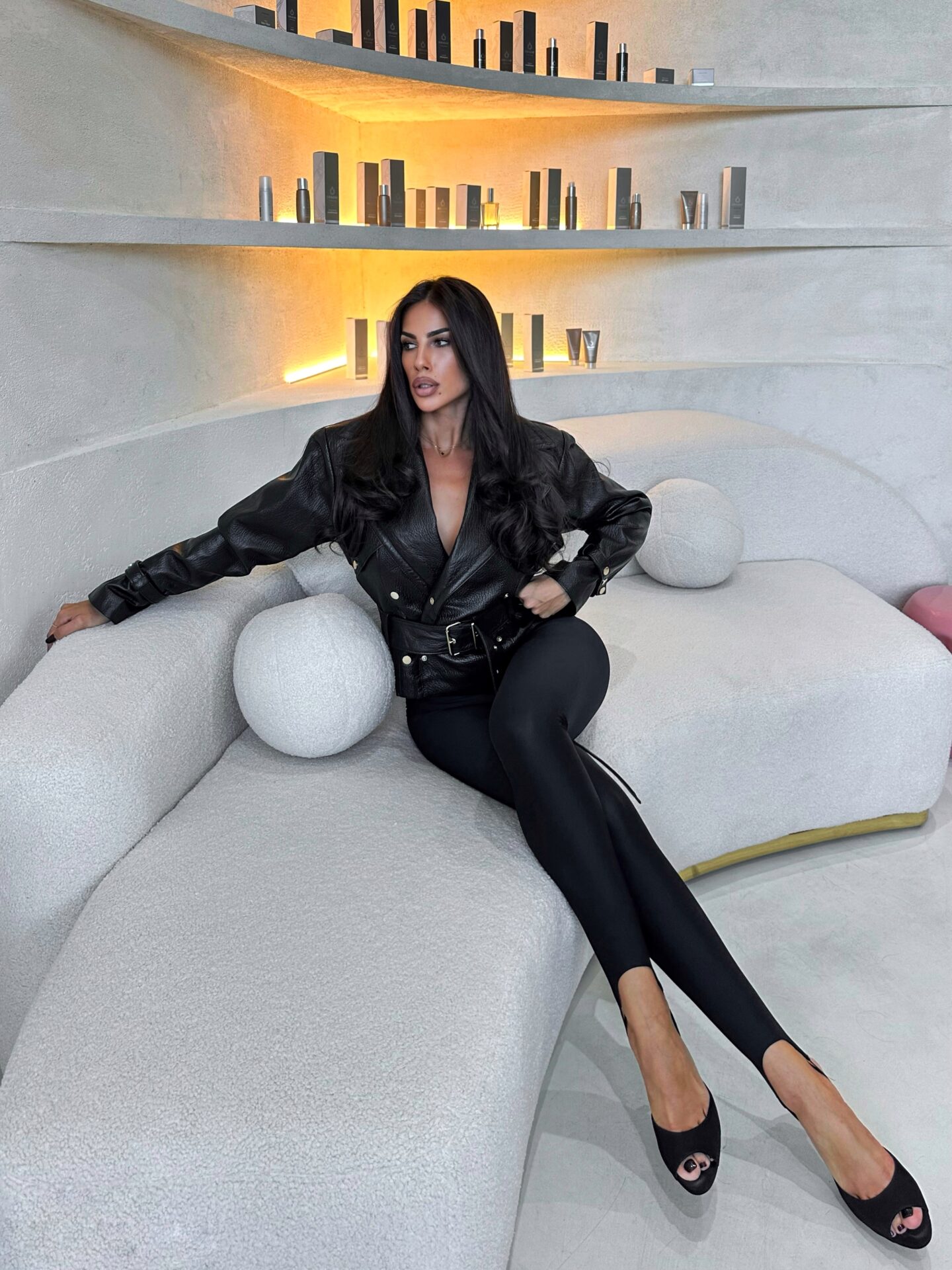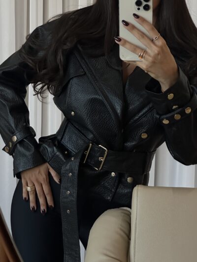 Jakna od visokokvalitetne koze,sa naramenicama. Duzina ispod struka sa kajisem i zlatnim detaljima.