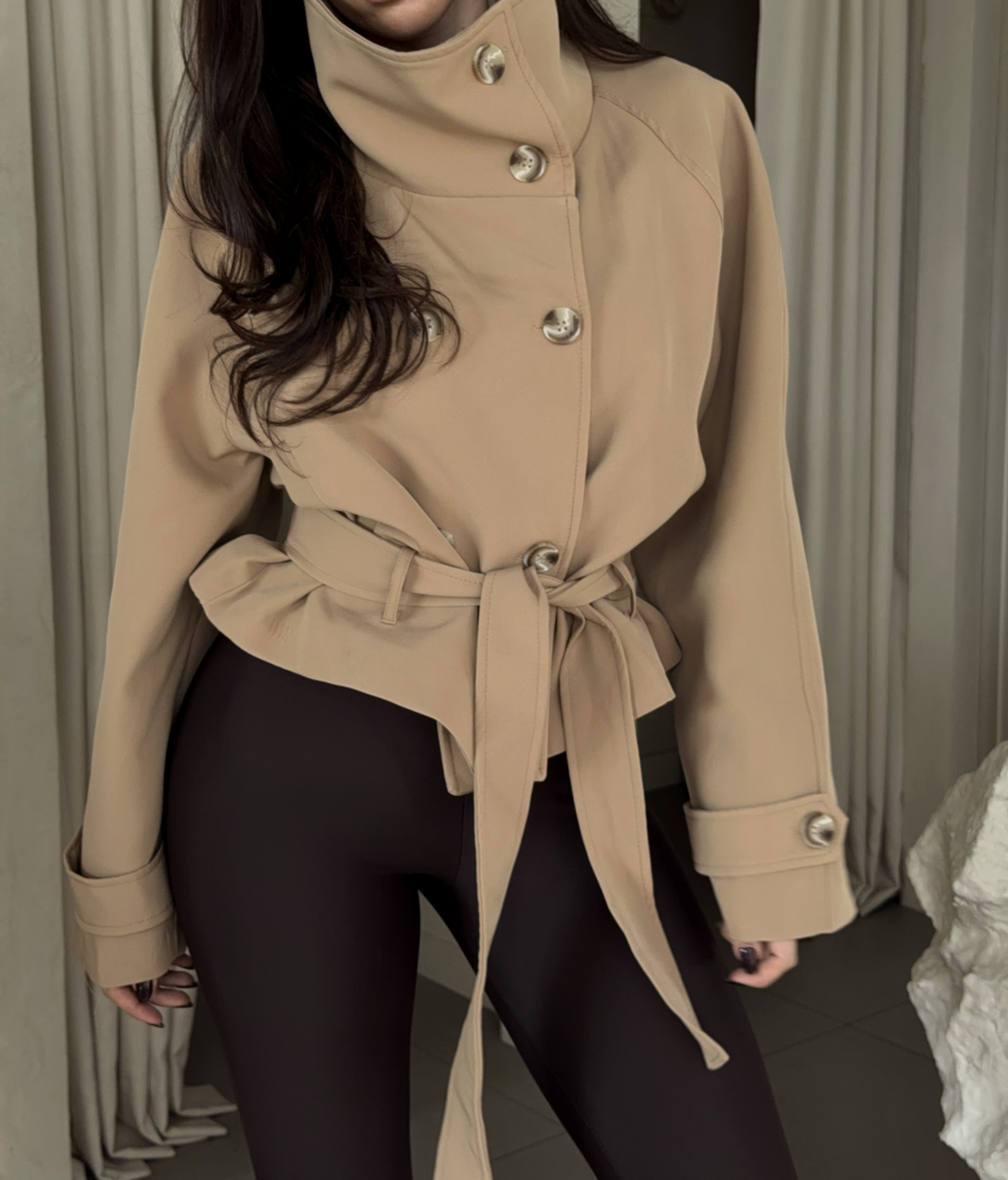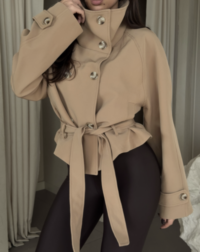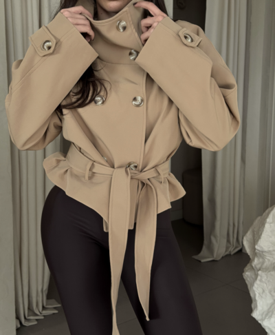 Kratka jaknica,podseca na skręceni kaput. Pojas u struku naglasava siluetu,dugmici su tamniji pa daje lep kontrast. Jaknica je idealna za prolece i jesen,odlicna za poslovne kombinacije,kao i za svakodnevno nosenje.