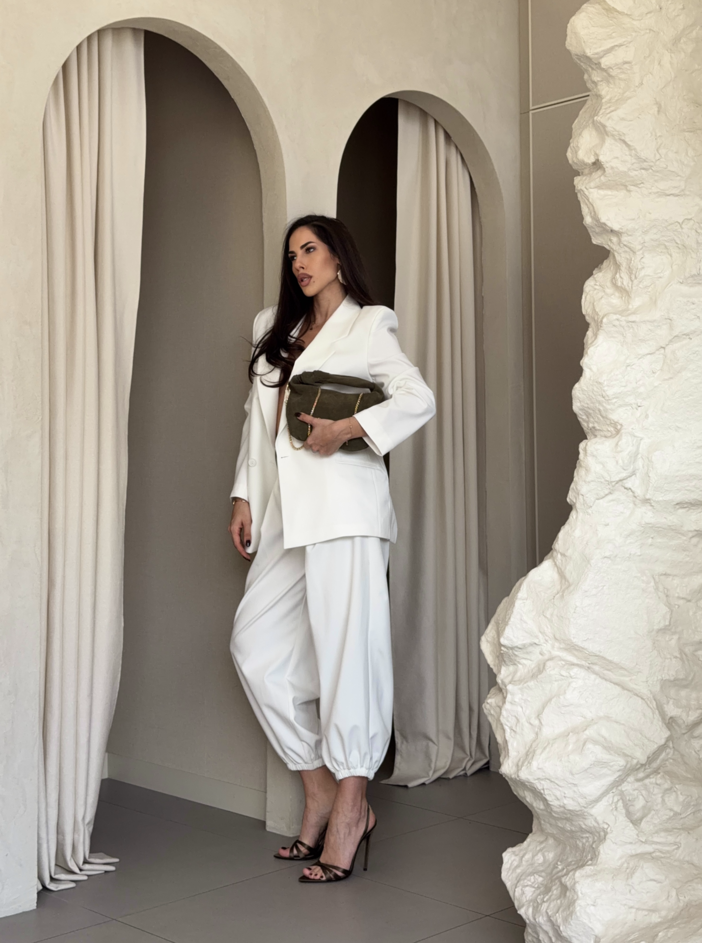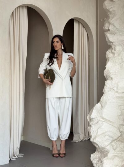 Pantalone su siroke sa lagano suzenim nogavicama i elasticnim zavrsetkom pri clancima.Ova kombinacija ga istovremeno cini elegantnim i udobnim.