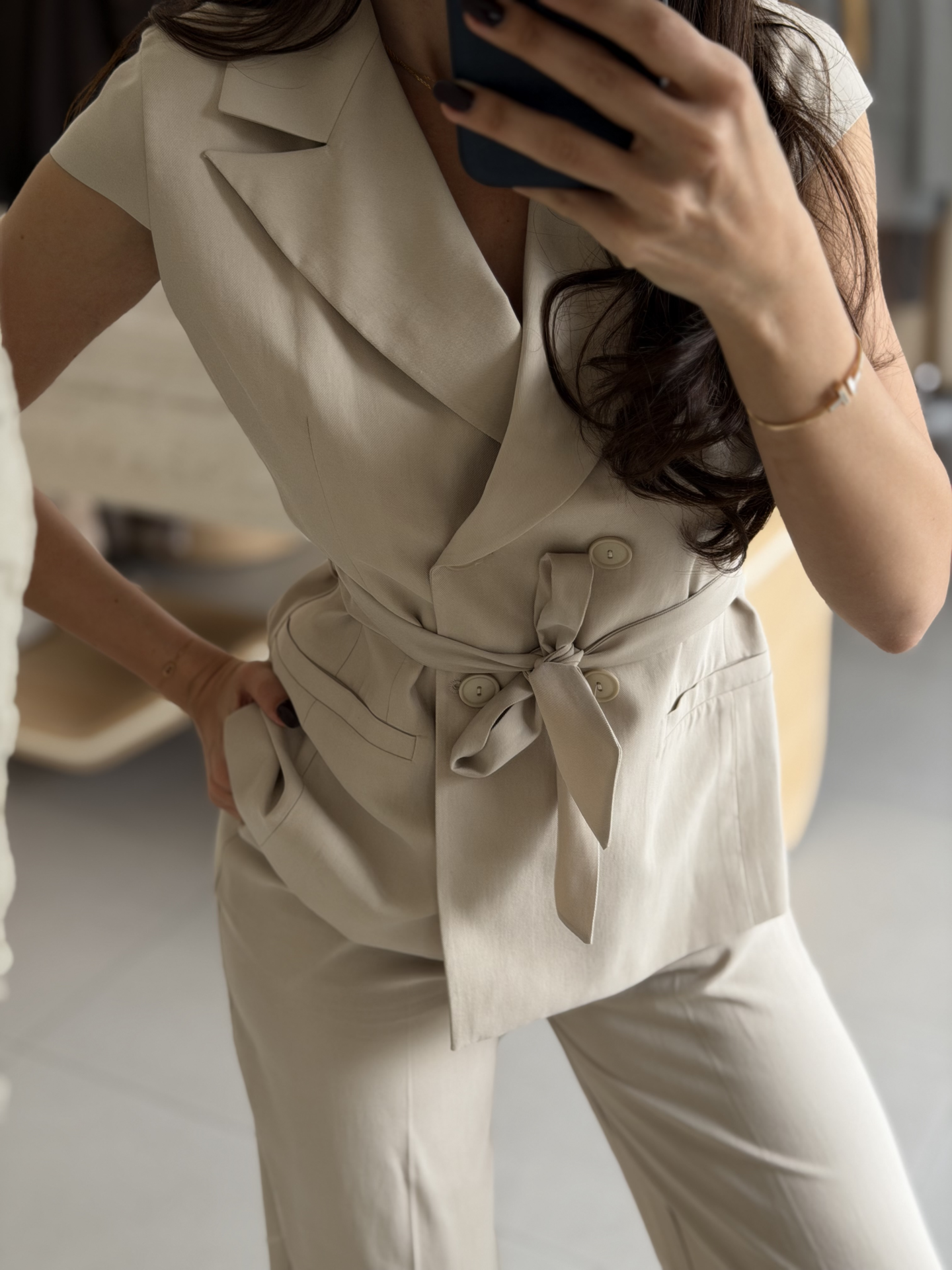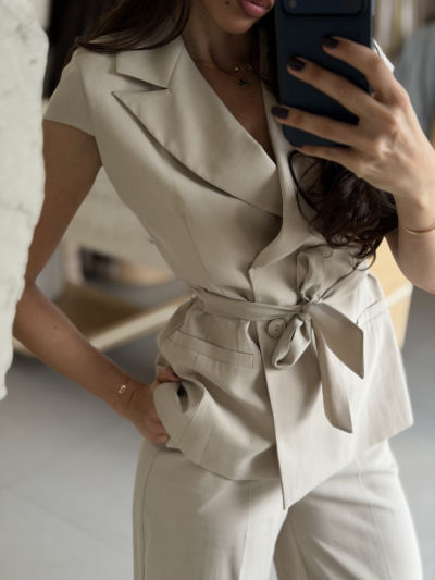 Komplet se sastoji od prsluka i pantalona. Pantalone su klasicnog kroja, prsluk ima pojas koji istice struk. Idealno za poslovne, svecane i svakodnevne varijante.