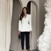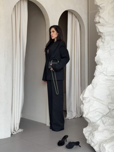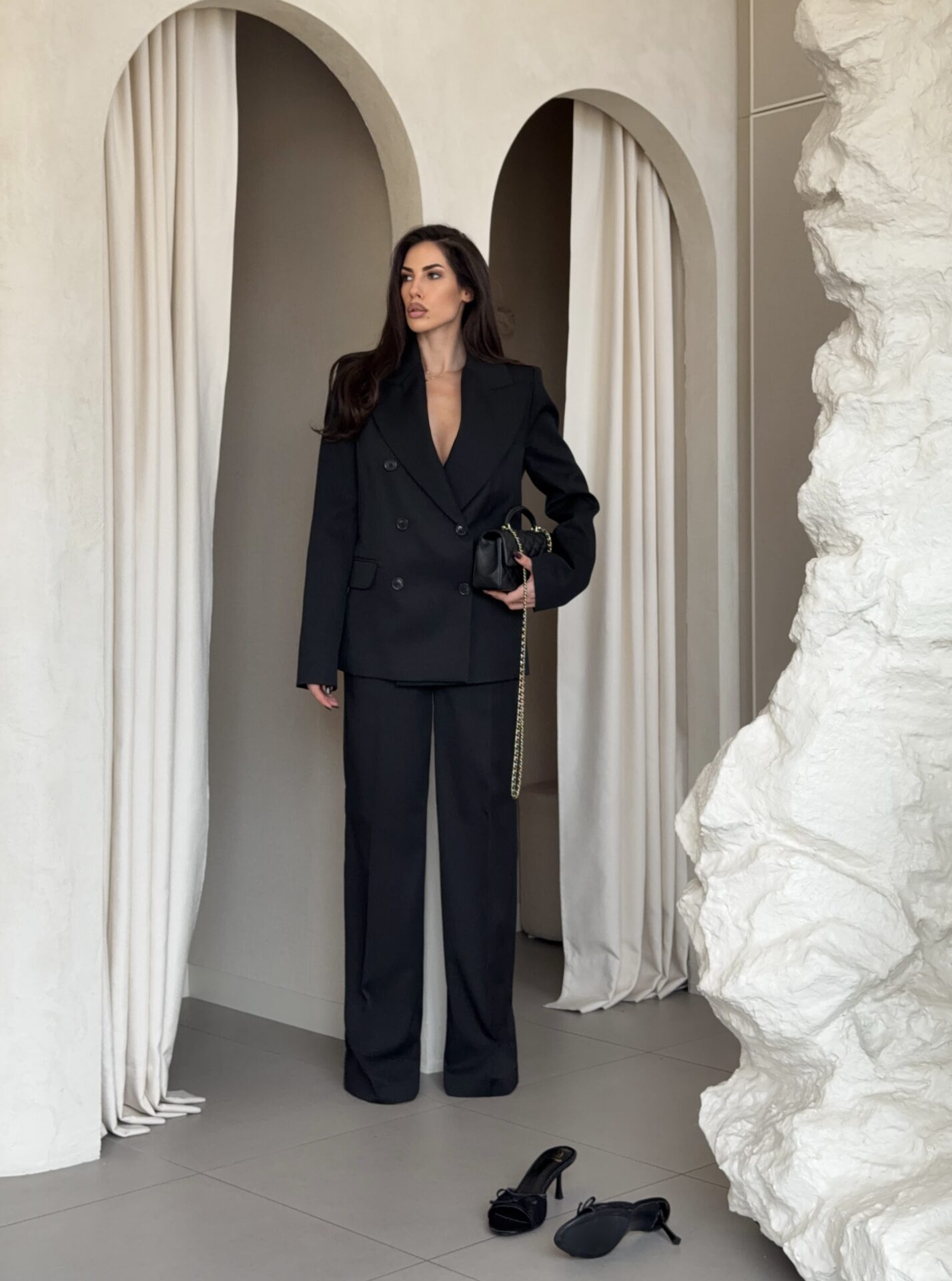 Sako je duplog kopcanja są naglasenim ramenima,sto daje strukiran izgled.Kroj je blago oversize,ali i dalje zadrzava zenstvenu liniju. Pantalone su ravnog,sirokog kroja.Padaju ravno i daju produzenu siluetu stvarajuci sofisticiran utisak.