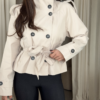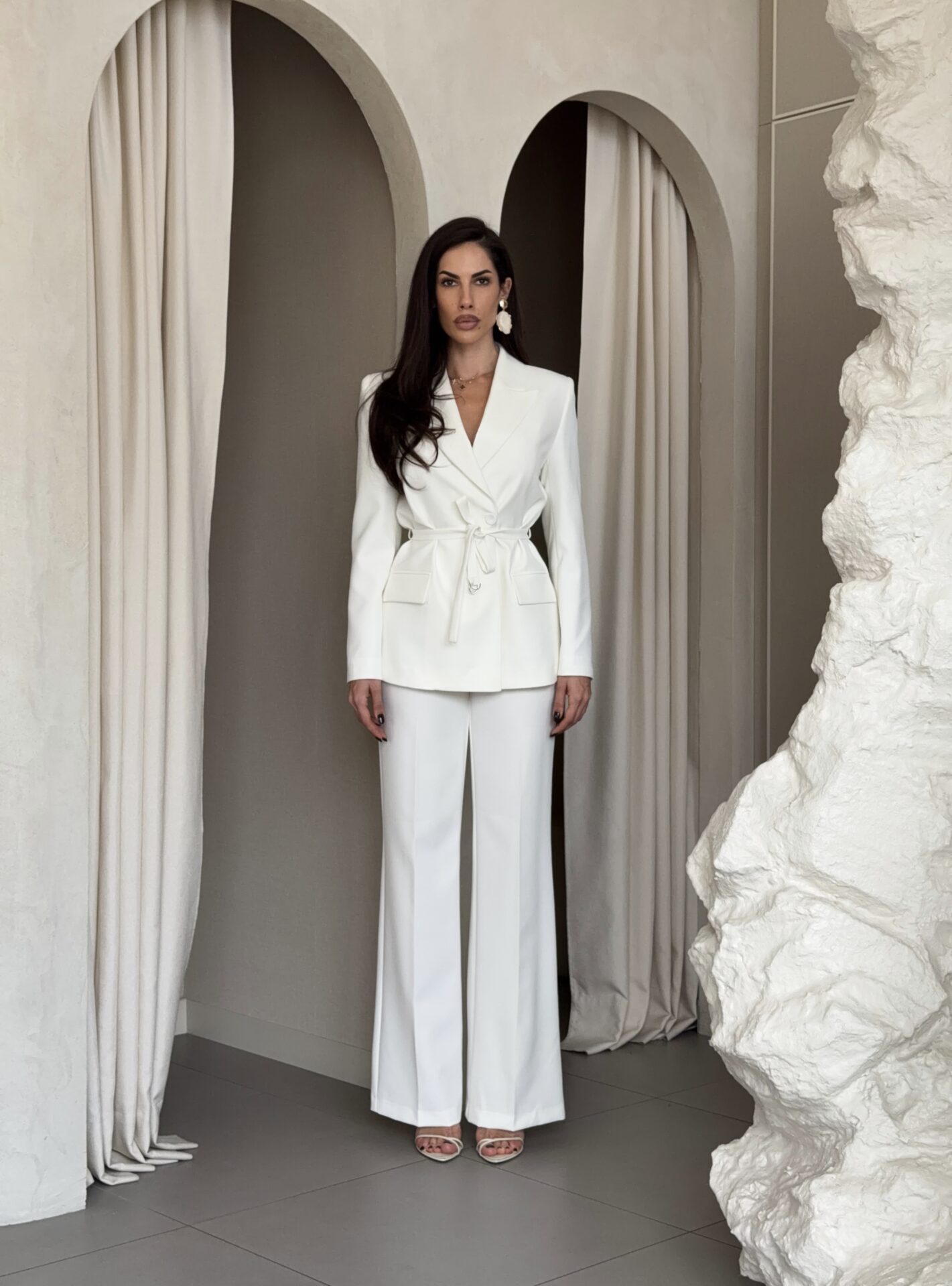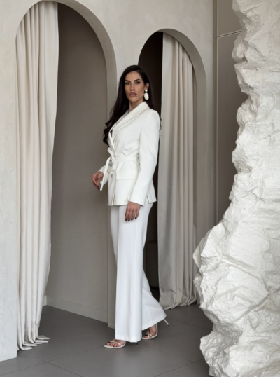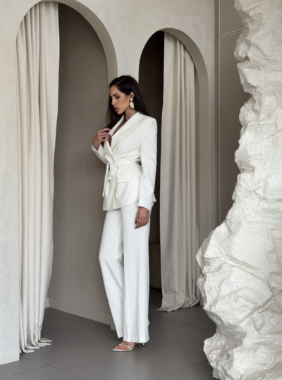 Elegant komplet,lepo strukiran sa naglasenim ramenima. Pojas u struku dodatno stvara zenstvenu siluetu. Pantalone su sirokog,ravnog kroja i visokog struka.